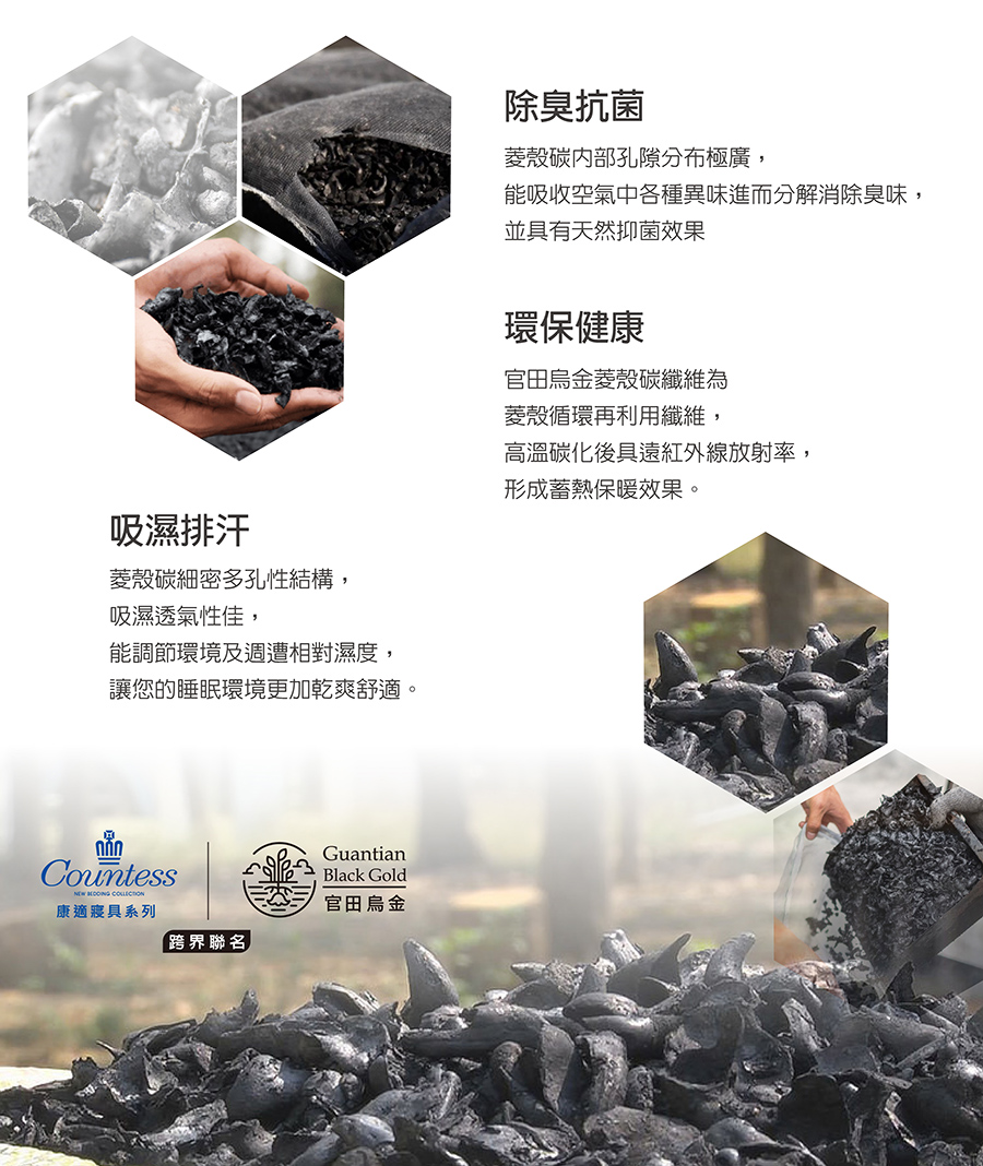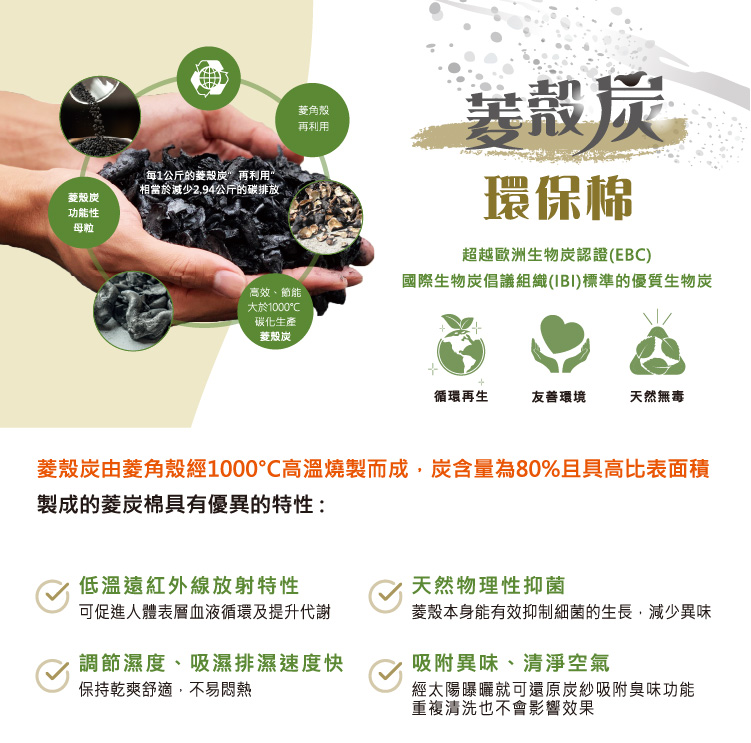 菱角殼經過攝氏 1000 度高溫碳化,轉化為優質「菱殼炭」,含碳量高達 80% 以上,擁有多孔隙結構與高比表面積。除了吸濕透氣與抗菌效果,更能有效固碳,每 1 公斤菱殼炭再利用,相當於減少 2.94 公斤的碳排放,兼顧舒眠與環境永續。